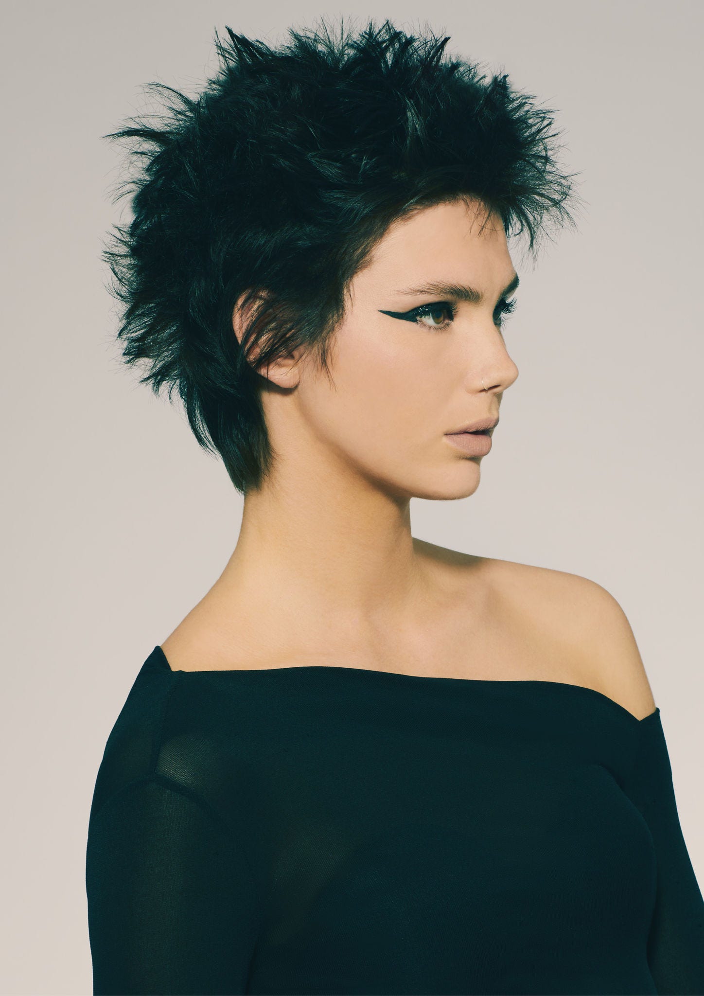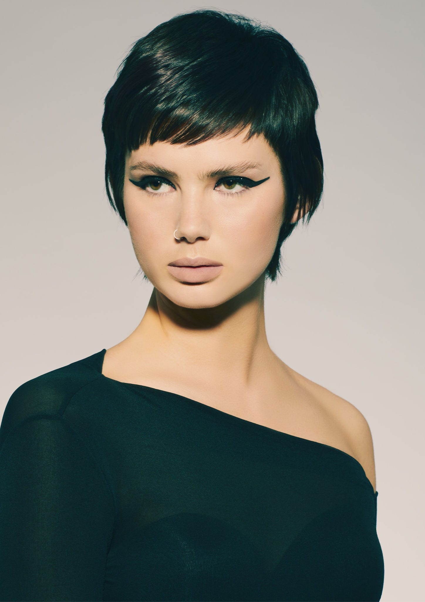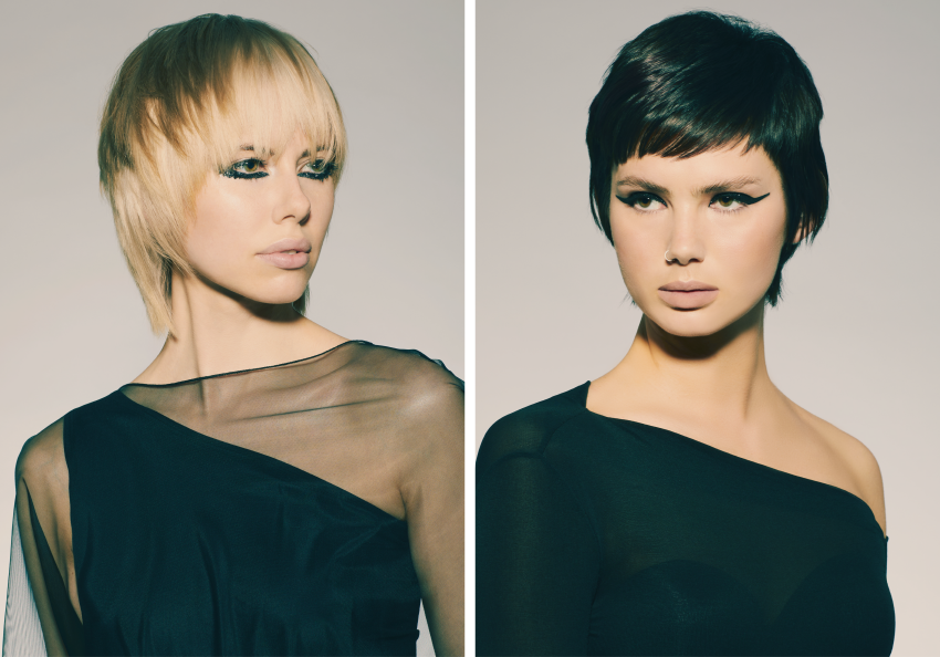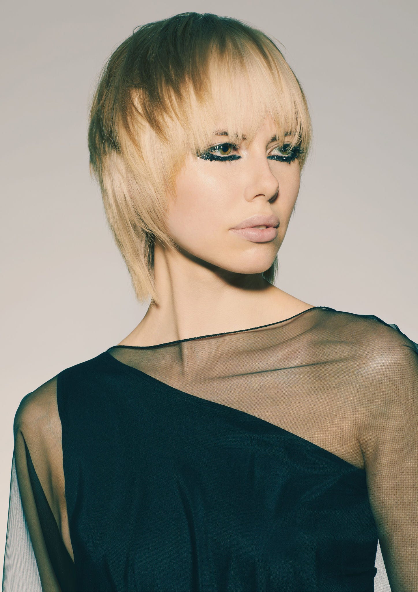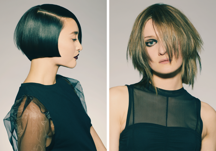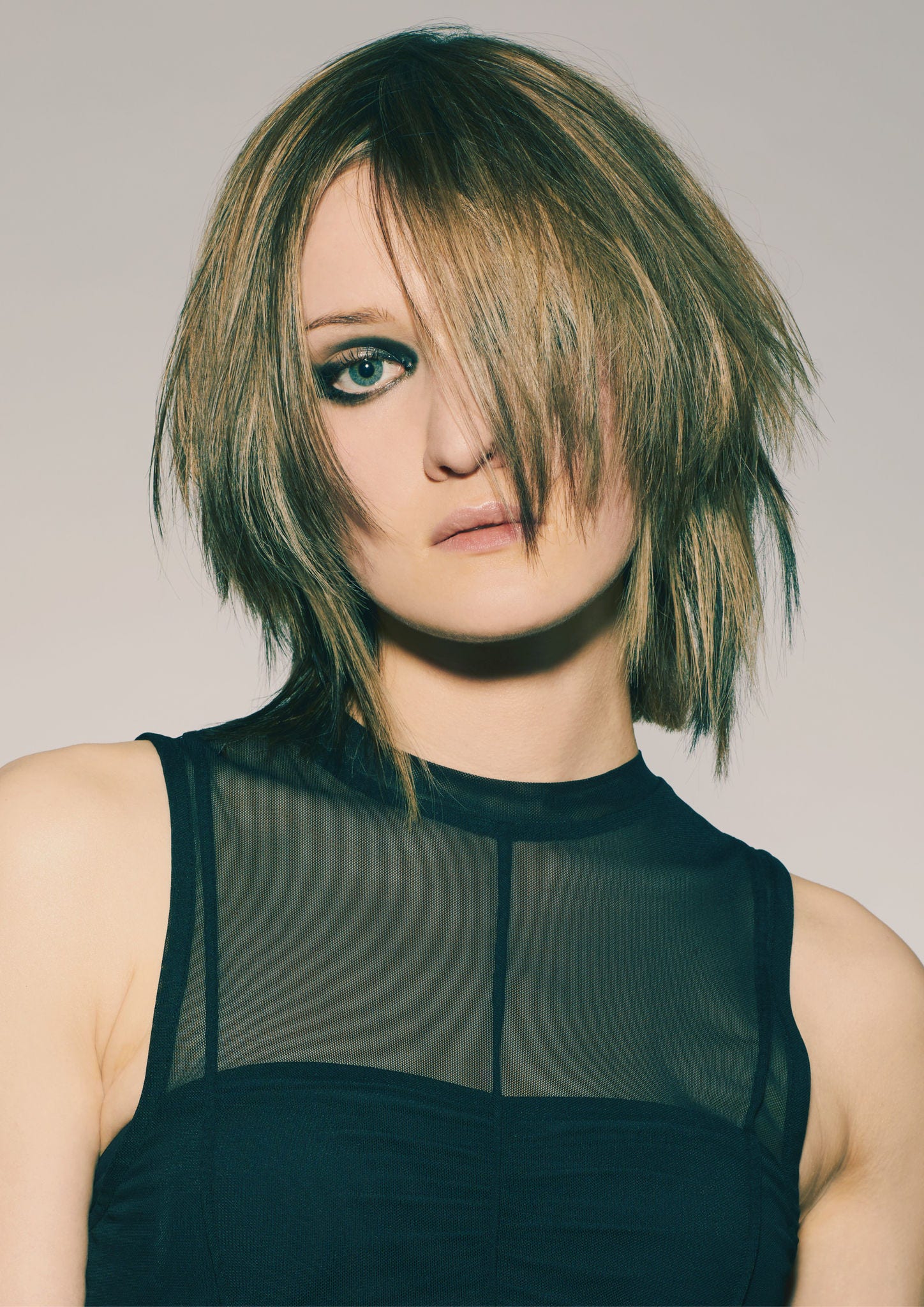 The cuts feature an extreme range of textures and lengths. A classic short shake is modernised by concealed, disconnected elements. Head hugging, gamine layering uses a new trigon sectioning pattern. The signature bob is cut classically then subverted into a halo of soft spikes. Curls, mid length and longer lengths include internal and external geometric shapes that provoke the hair or use the face as an architectural frame.