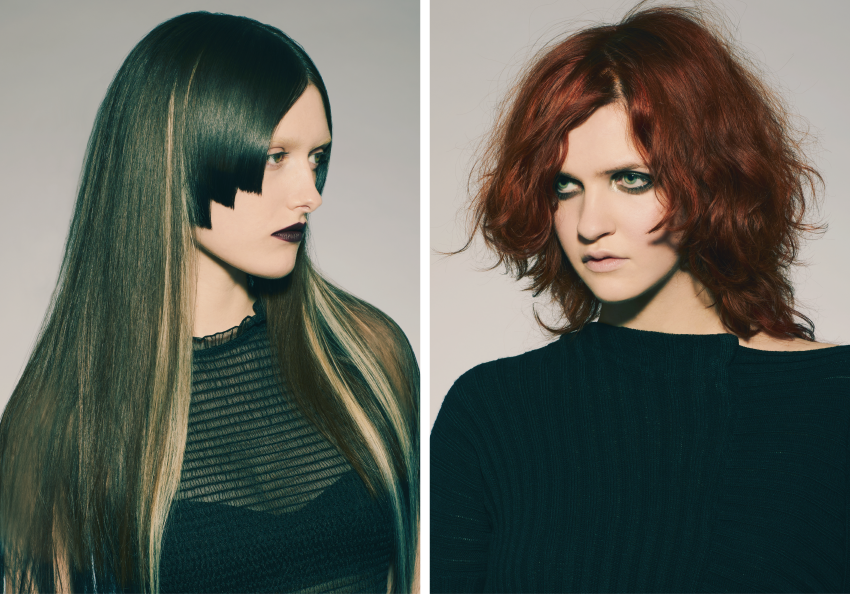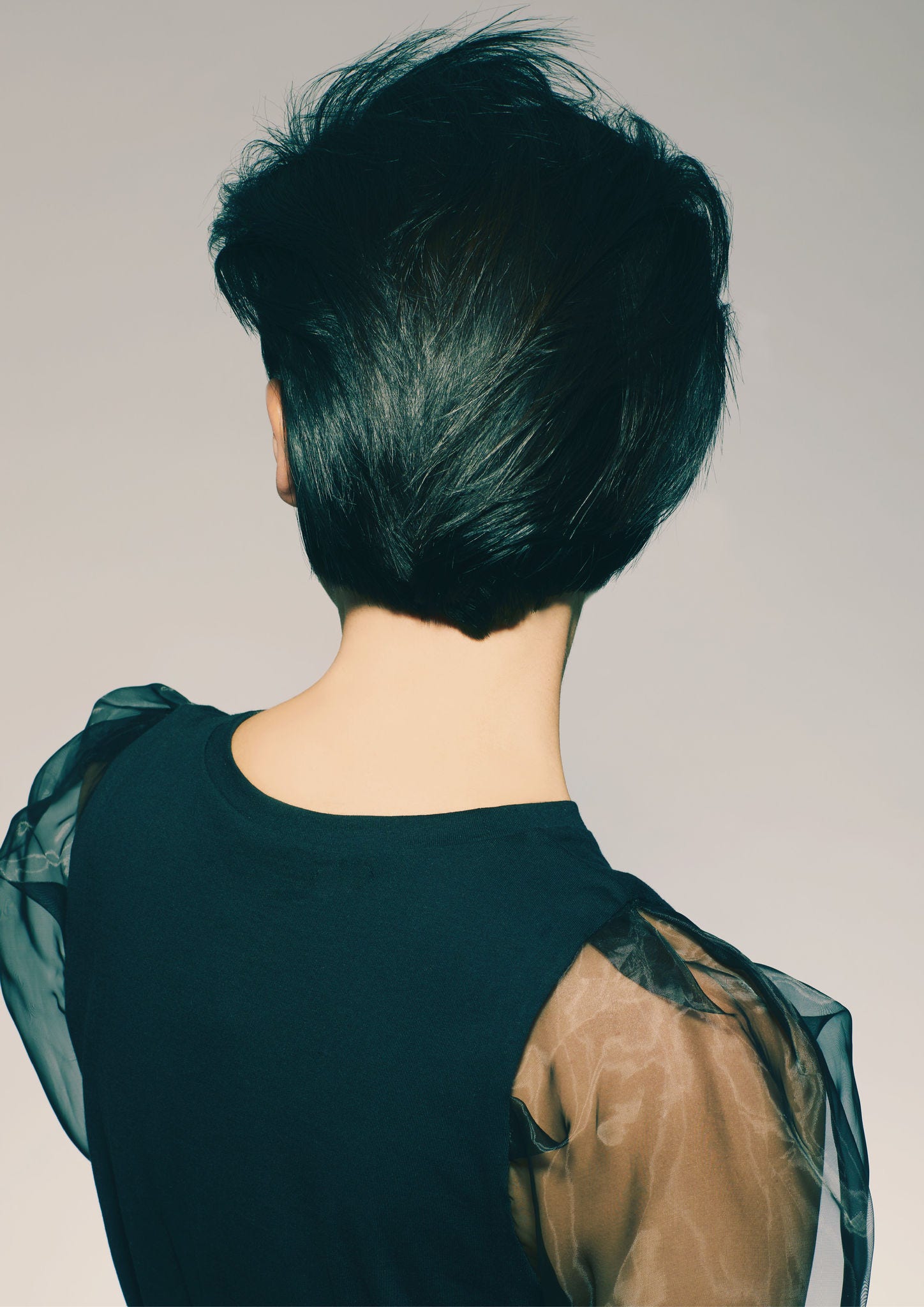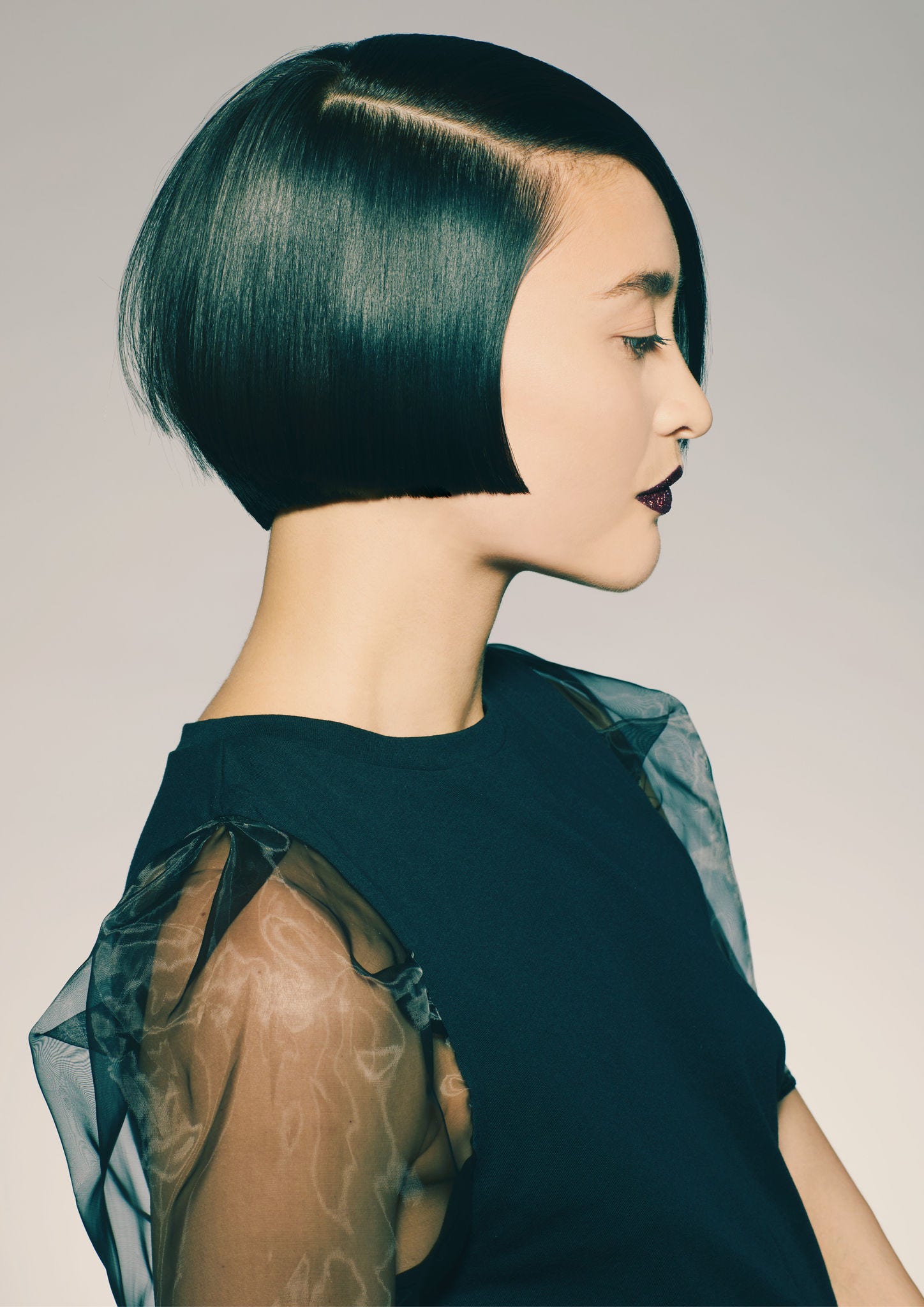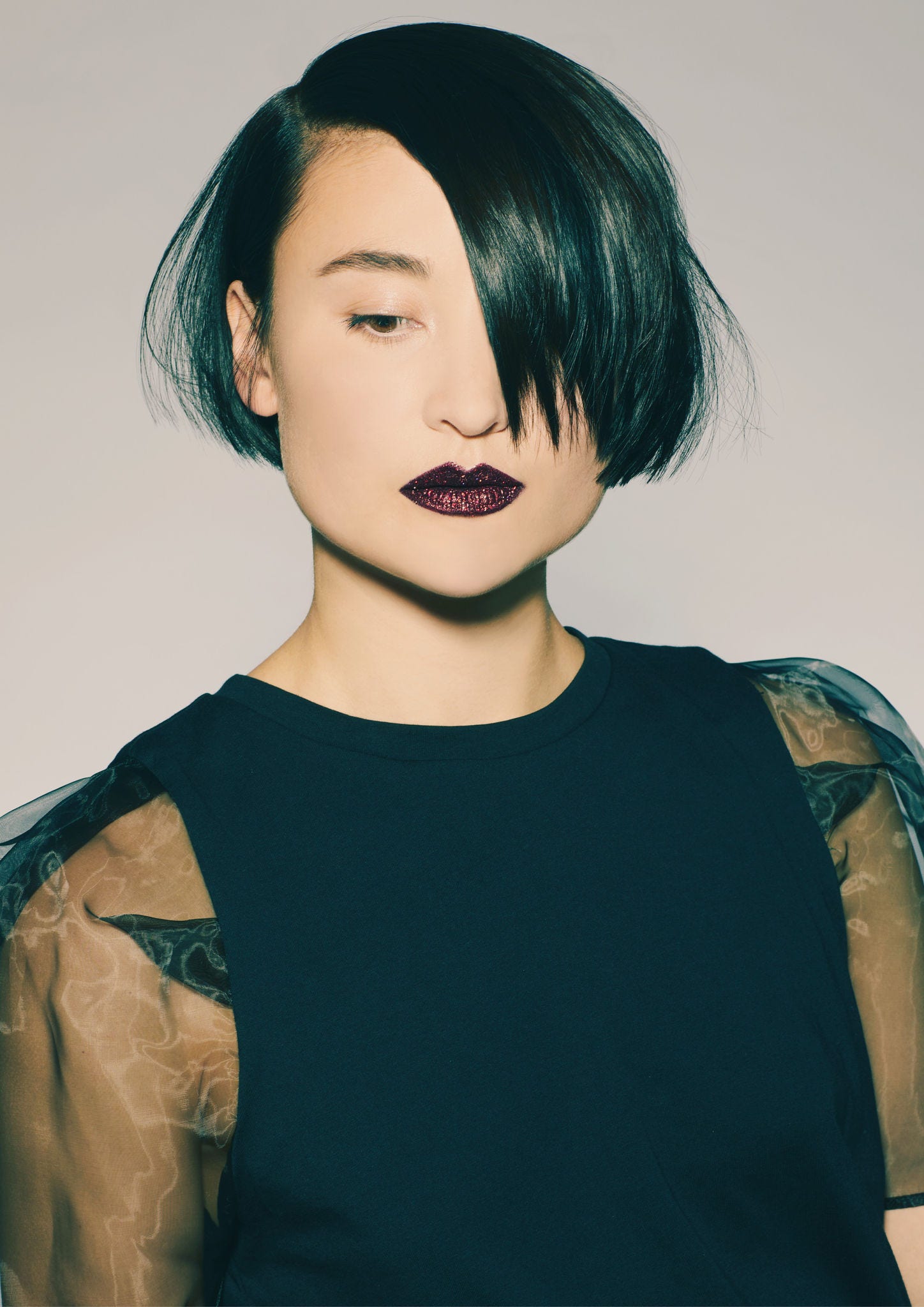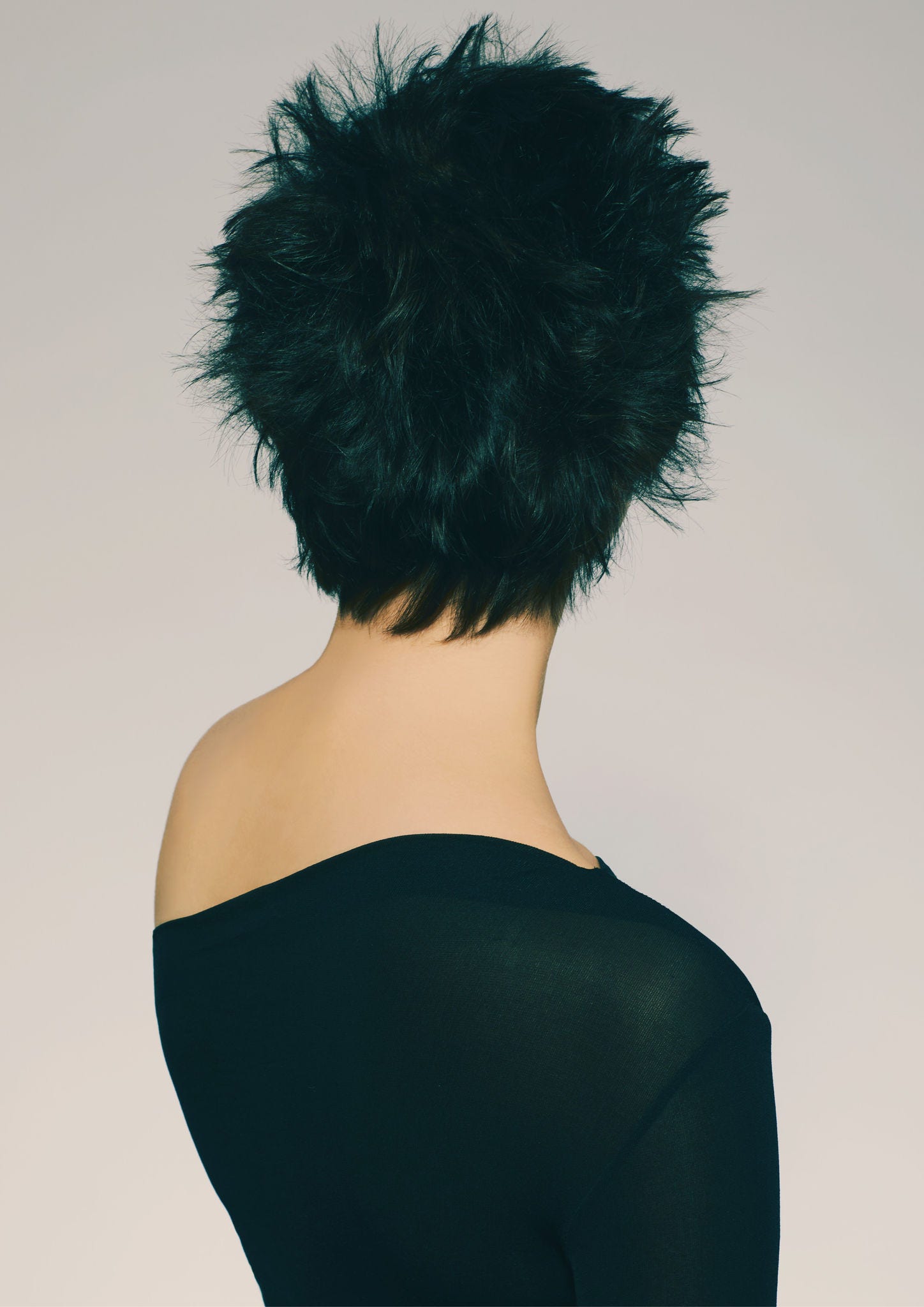 The cuts feature an extreme range of textures and lengths. A classic short shake is modernised by concealed, disconnected elements. Head hugging, gamine layering uses a new trigon sectioning pattern. The signature bob is cut classically then subverted into a halo of soft spikes. Curls, mid length and longer lengths include internal and external geometric shapes that provoke the hair or use the face as an architectural frame.
