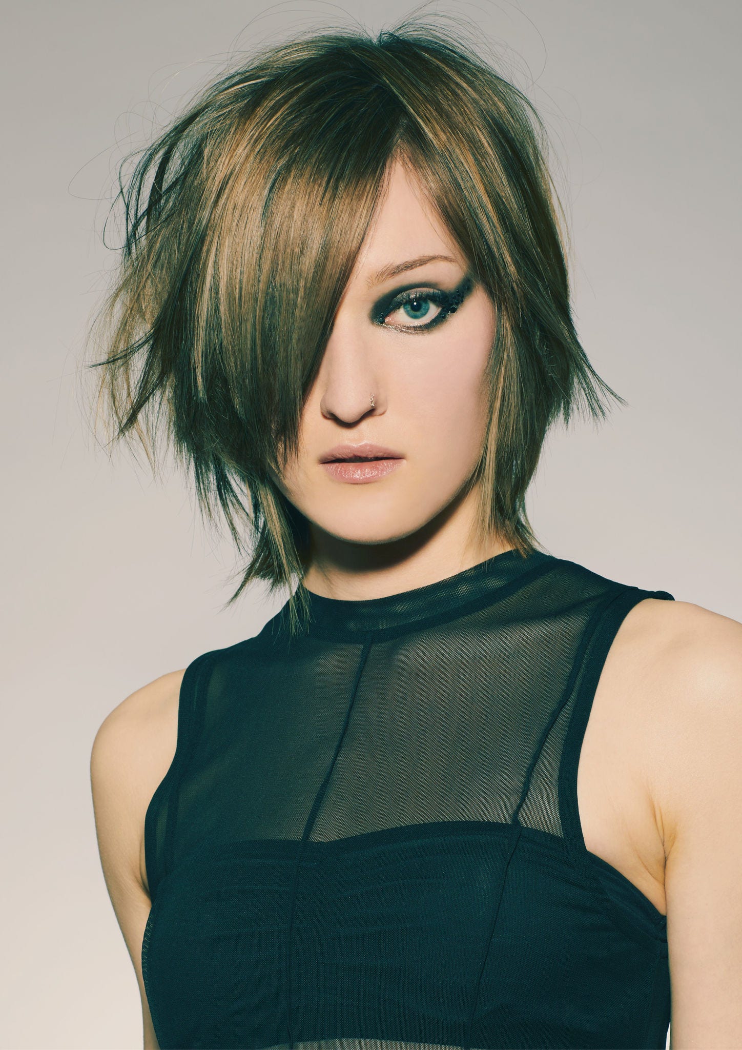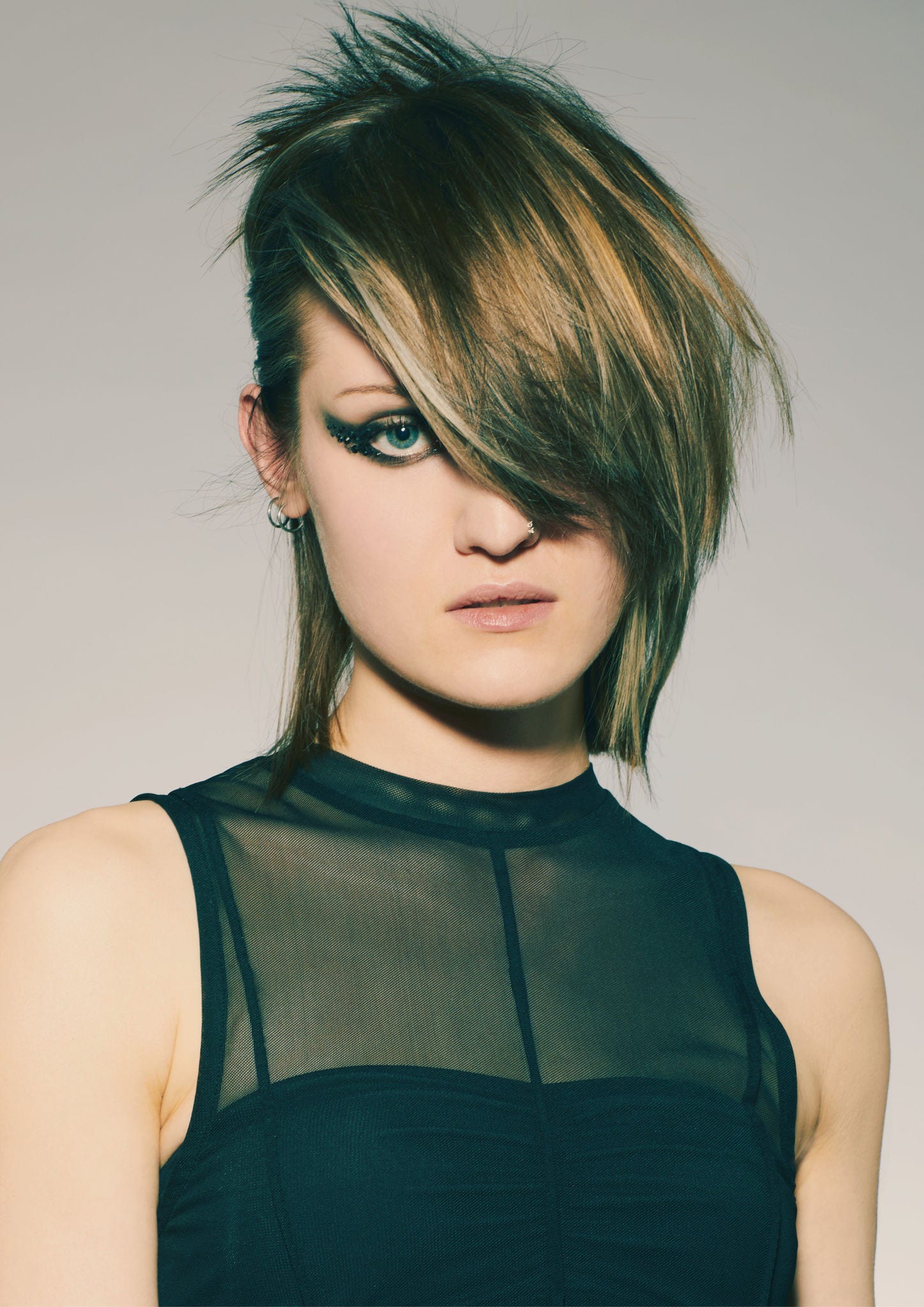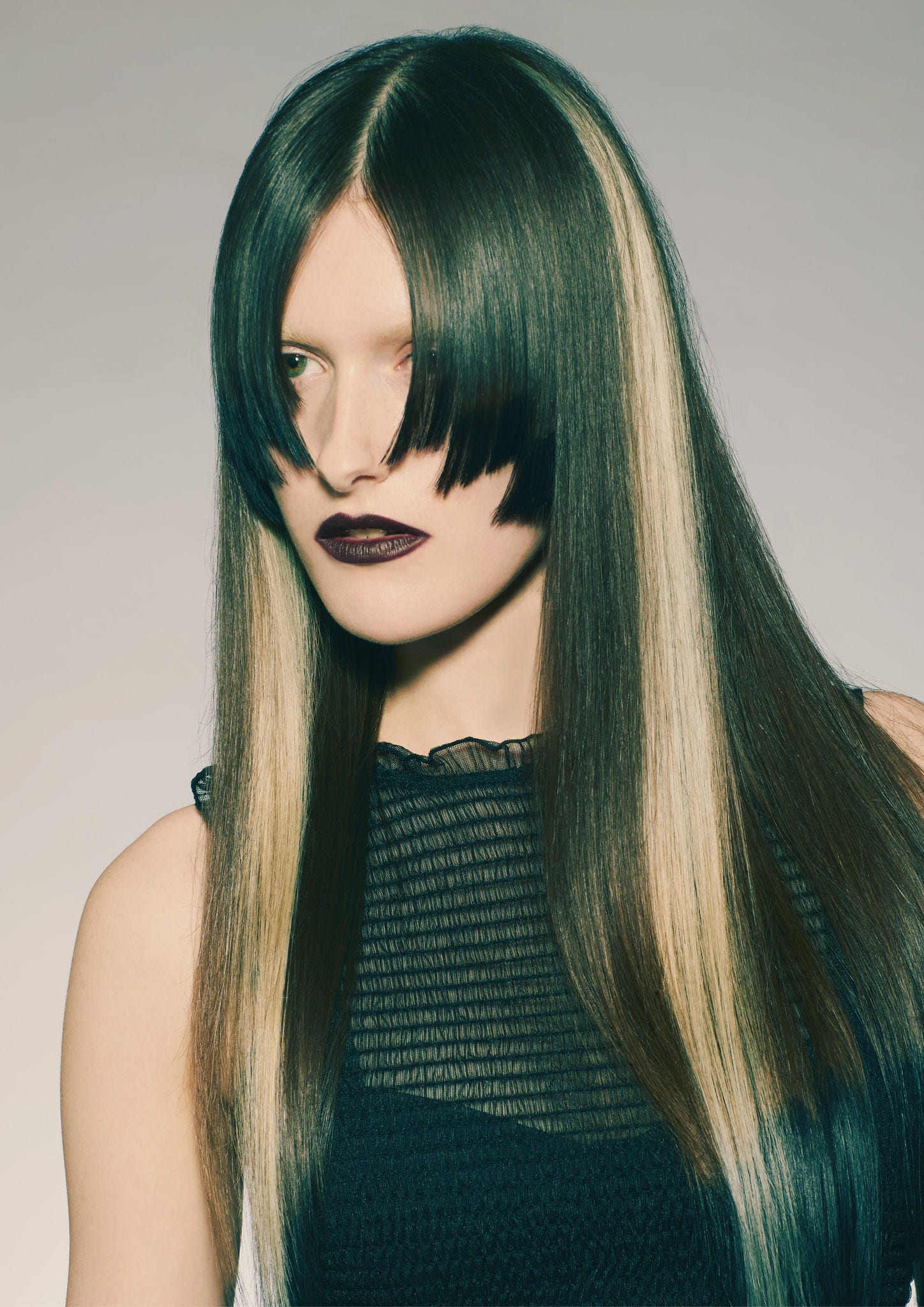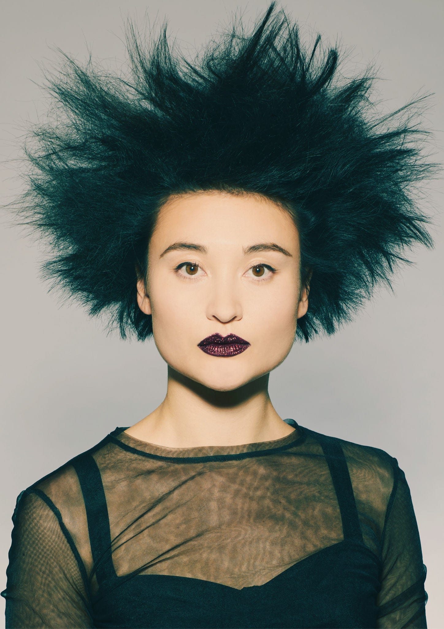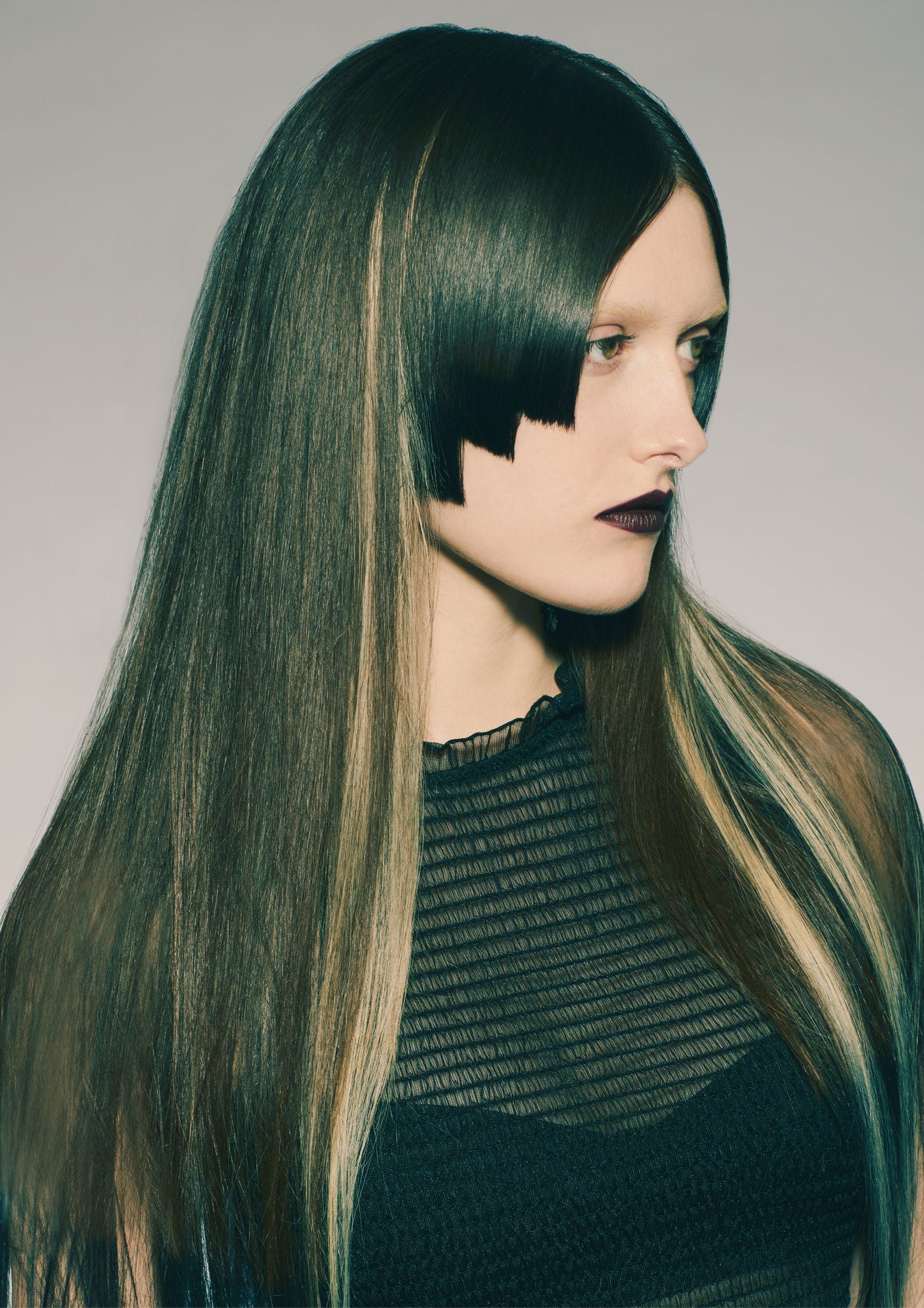 The cuts feature an extreme range of textures and lengths. A classic short shake is modernised by concealed, disconnected elements. Head hugging, gamine layering uses a new trigon sectioning pattern. The signature bob is cut classically then subverted into a halo of soft spikes. Curls, mid length and longer lengths include internal and external geometric shapes that provoke the hair or use the face as an architectural frame.