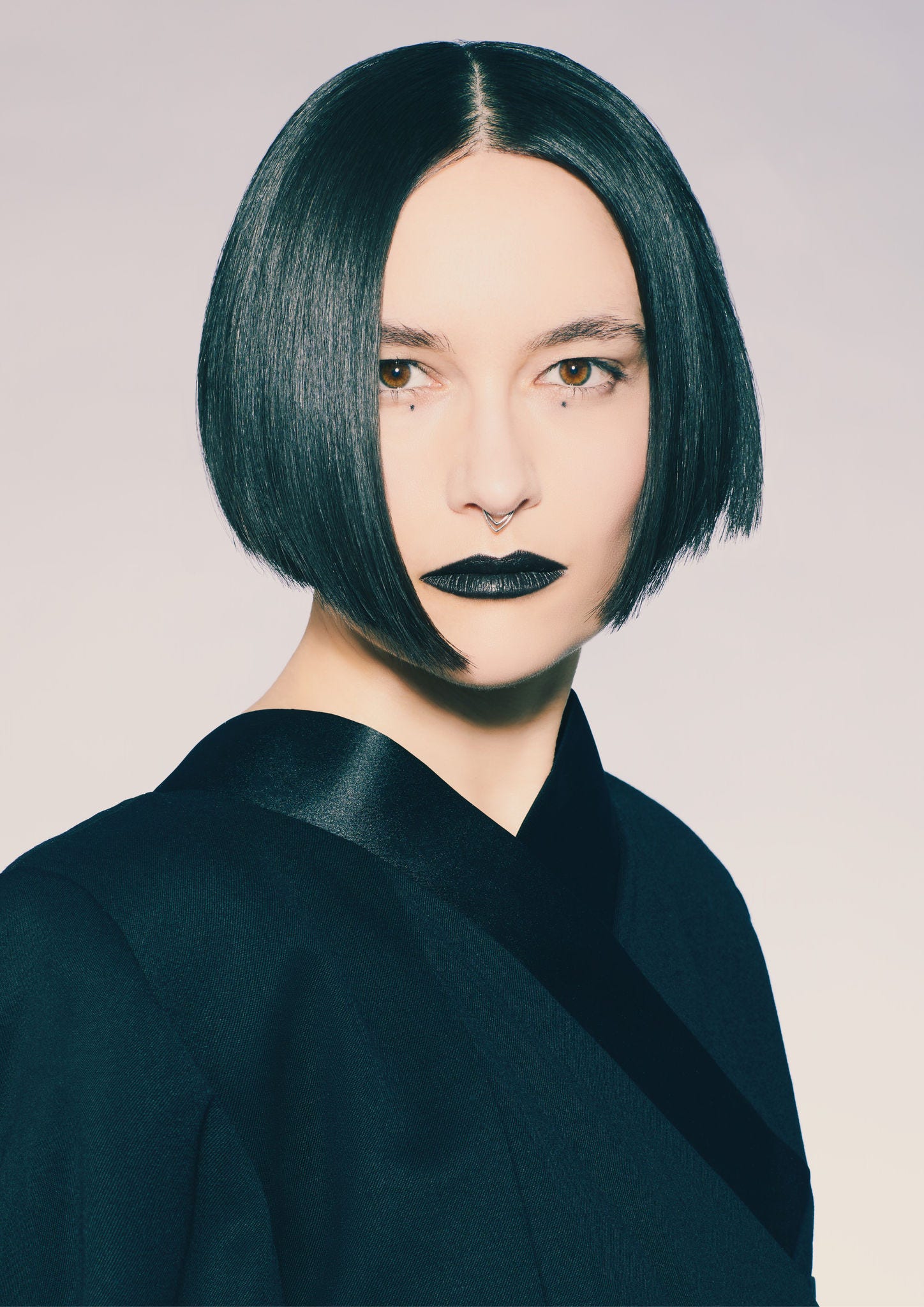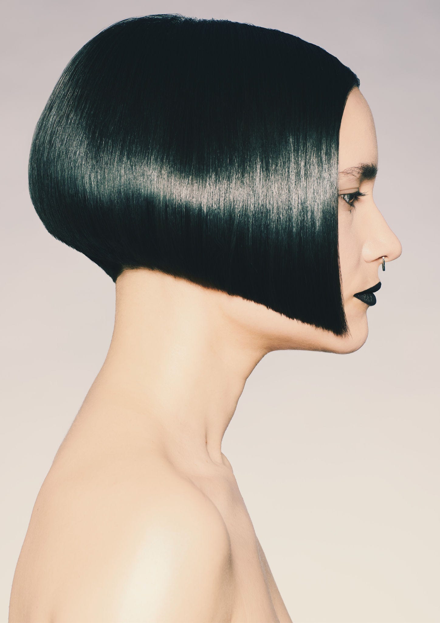 The next capsule collection is inspired by the Nancy Kwan cut, the Sassoon signature look and the most visual manifestation of the brands ethos. For this collection it is created with a twist, either classically cut, with reverse layers or the new Trigon sectioning pattern. The colours feature geometric patterns, sombre and ash based in deepest marine blue in a chocolate base or steel grey in a natural blonde.