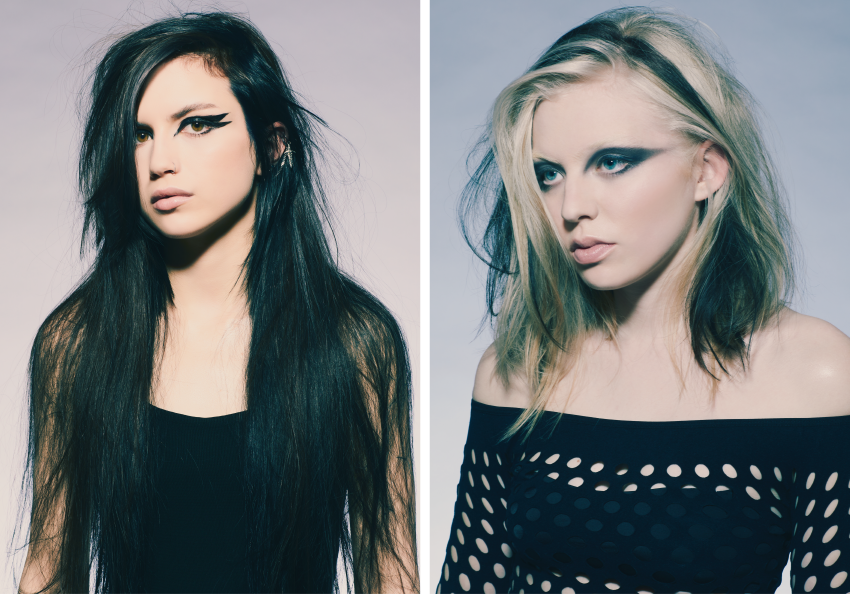 The shortest looks are punk inspired with fine strips of hair that slice through the cuts producing a saw tooth effect. The colours are infused in back-to-back slice panels in ashy tones of green, lavender, violet and brown or vivid elliptical bands of blood red and violet.